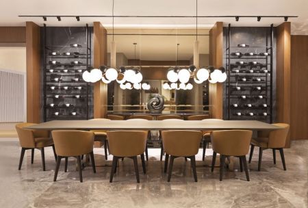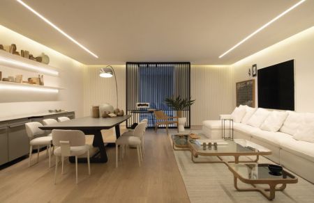 “Projetamos um ambiente amplo, integrado, com linhas retas e simétricas, além das bases marcantes. Fiz isso pensando em uma rotina familiar mais orgânica, de pessoas que adoram se reunir com parentes e amigos. A essência, o ponto inicial do projeto, foi a grande sala de jantar.”