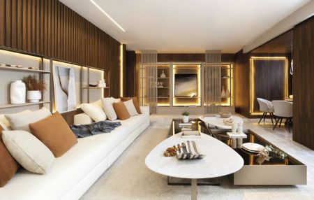 Para a quarta participação na Mostra Artefacto, Viviane criou um ambiente de 91,72 m² que contempla living e um espaço gourmet com mesa de  jantar. Para a arquiteta, o destaque é o contraste entre os materiais naturais presentes no mobiliário e na marcenaria.