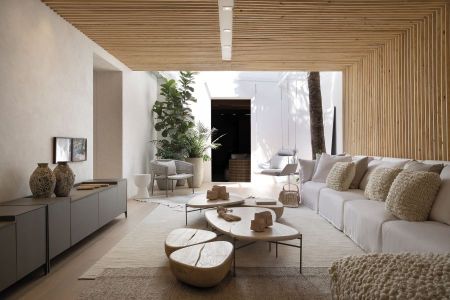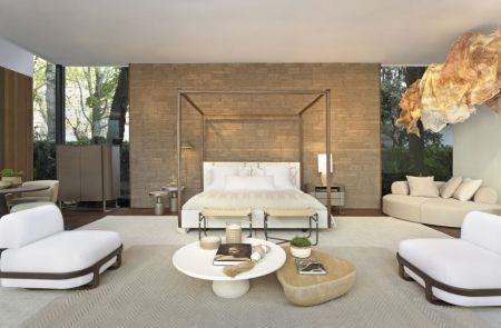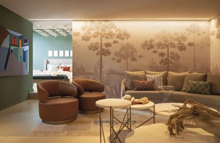 “O DNA Natural foi trabalhado de diversas formas no espaço, a começar pelo layout mais despojado do mobiliário, em que o living acontece de maneira circular, permitindo diversos arranjos em sua utilização. O jantar ao fundo contempla o jardim, assim como o quarto, que se abre para a área externa.”
