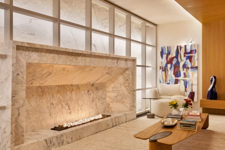 “A palavra ‘lareira’, já tem uma relação com a palavra ‘lar’, para mim ela é um elemento fundamental para os momentos de contemplação e conexão com o lar”, pontua a arquiteta Roberta Lanza, que criou um desenho único de mármore para a idealização da lareira deste projeto.