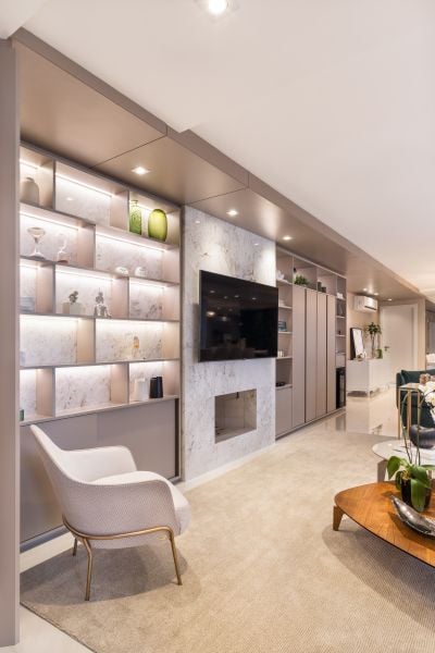 Com um conceito contemporâneo, a proposta conta com uma série de elementos que visam criar um ambiente confortável e ao mesmo tempo moderno. Levando em consideração o clima predominantemente frio da cidade, a arquiteta integrou as duas sacadas com a área interna, transformando tudo em um único ambiente.