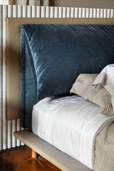 Com ares europeus e referências super atuais, o projeto relembra o período em que o designer viveu na Itália. Pedras naturais, madeira e alfaiataria trazem todo o aconchego que um quarto requer. Para ajudar a compor um espaço que “acolhe e a abraça”, a cama Refúgio, com desenho de Dal Bosco para a Reveev, é o grande destaque do ambiente.