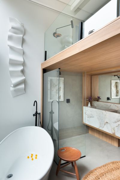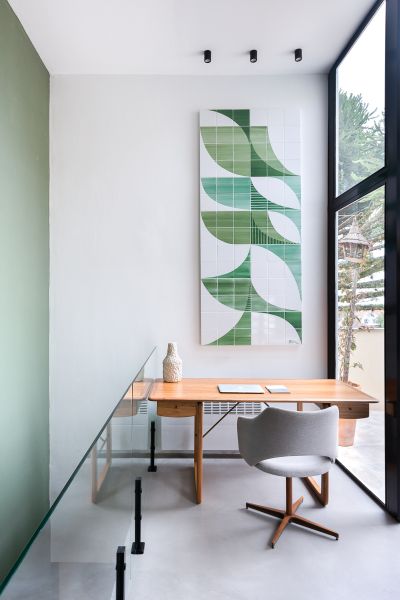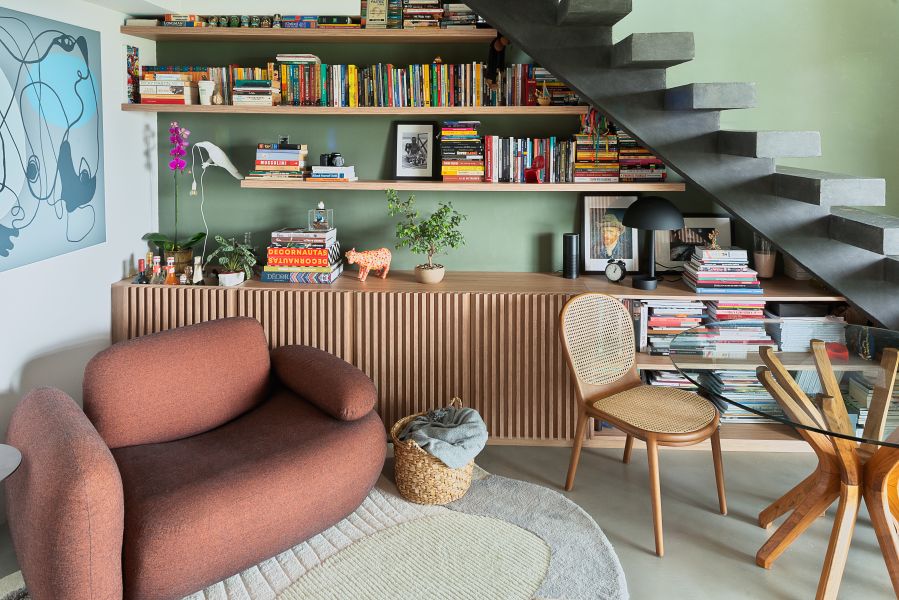 Como uma boa casa genuinamente brasileira, o mix de materiais e texturas garante muita personalidade a todos os espaços. A mescla de elementos projetados, com obras de arte de artistas locais e peças de mobiliário assinado, traduz a identidade dos moradores e contribui para tornar a proposta única. Na área social, o protagonismo fica por conta da biblioteca localizada sob a escada, que abriga o extenso acervo pessoal dos clientes.