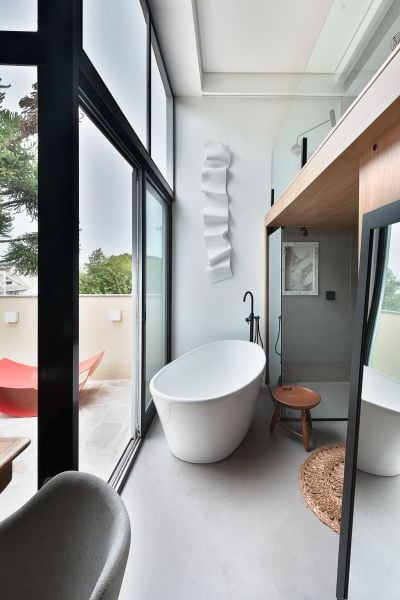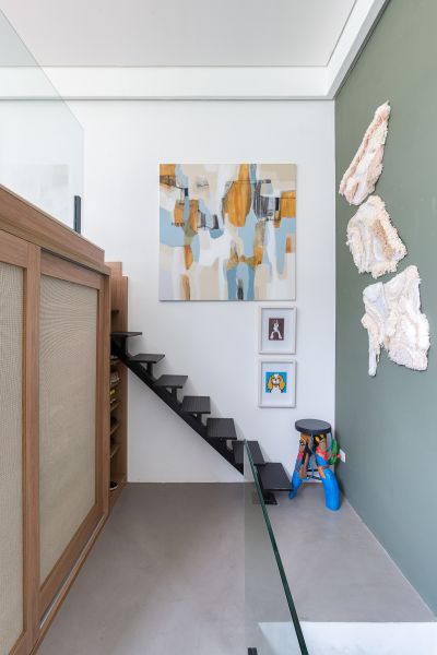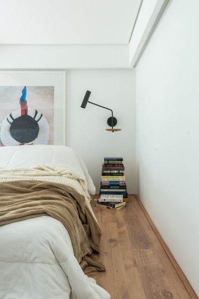No piso superior, um mezanino abriga a área íntima. O quarto “aberto” e integrado aos demais ambientes segue a mesma linha do restante do projeto, com muitos livros, texturas e obras de arte. A iluminação foi pensada de forma a valorizar o ambiente, destacando a decoração e ampliando a sensação de aconchego.