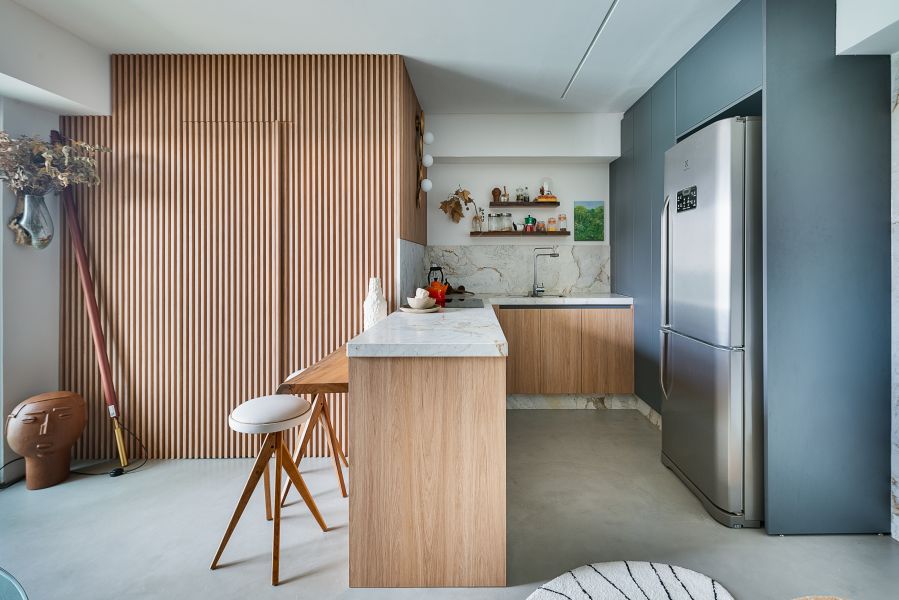 Idealizado para um casal jovem, este studio de 70 m², situado em uma cobertura, é pura brasilidade. Quem assina o projeto, localizado em Curitiba, é a arquiteta Karolinna Venturi, que apostou no uso de cores que remetessem ao natural para traduzir o conceito da proposta. Materiais como madeira e mármore contrastam com cores sólidas, como o verde, o branco e o cinza.