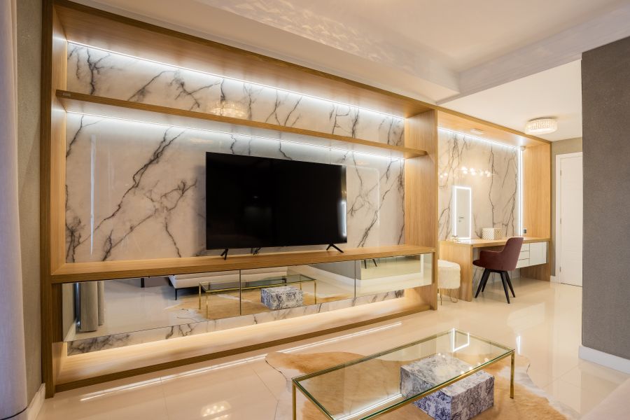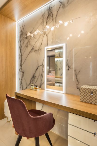 Para trazer praticidade ao dia a dia da cliente, a bancada conta com uma área de penteadeira e armazenamento de itens pessoais, como caixas e bolsas. No projeto luminotécnico, foi priorizada a iluminação indireta, com o uso de perfis embutidos na marcenaria e um pendente em cima da penteadeira.
