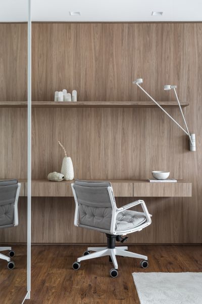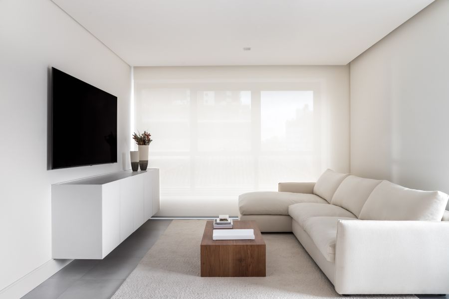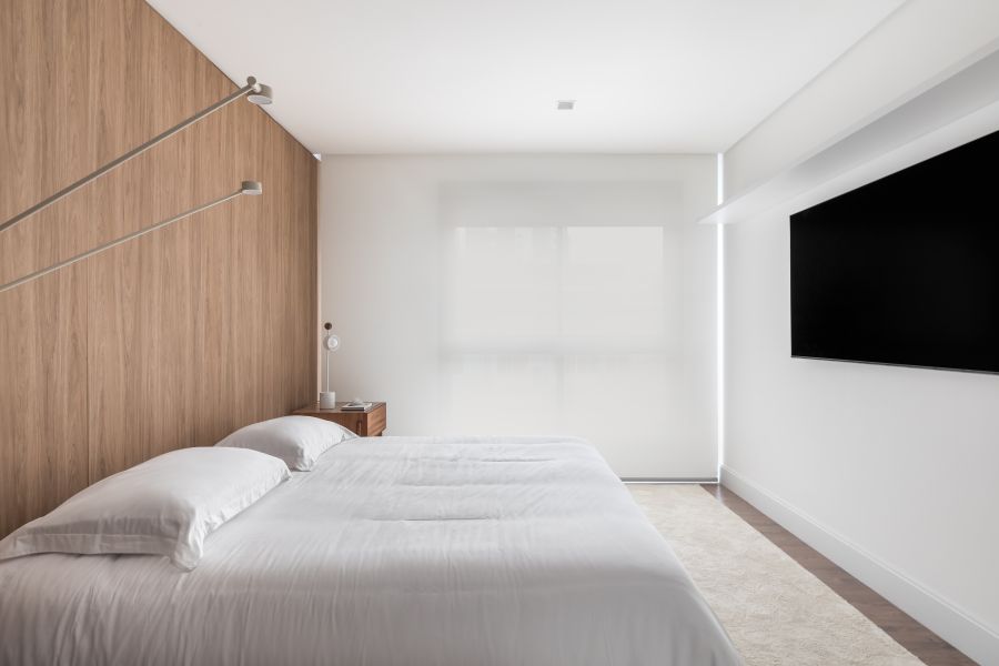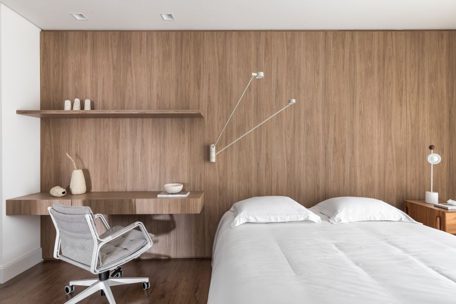 dos pedidos da moradora –, reforça a proposta. Para o melhor aproveitamento do espaço disponível, o profissional apostou em um mobiliário inteligente da SCA Curitiba, como a cabeceira/office no quarto e os painéis no living, que escondem áreas de armazenamento.