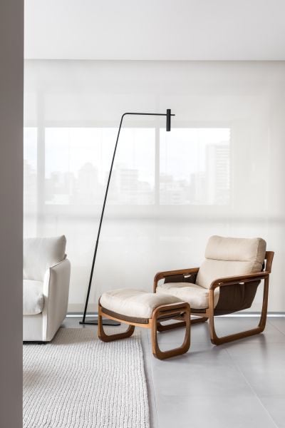 A iluminação técnica foi pensada para pontuar apenas o necessário, enquanto as peças de design de uma marca curitibana complementam a proposta, fazendo alusão ao pertencimento local e ao design brasileiro.