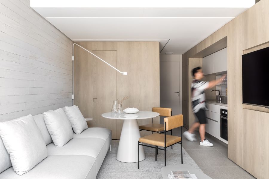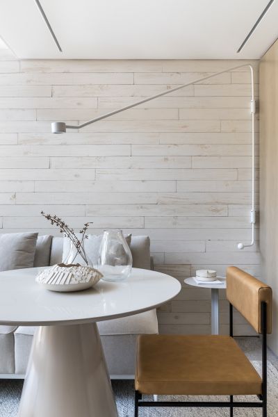 O uso de concreto branco, pedras escovadas e madeira lavada ganhou uma nova leitura no ambiente, que, apesar de possuir uma metragem reduzida, tornou-se amplo e funcional. O contraste de materiais, texturas e luzes cria uma atmosfera aconchegante e agradável, tanto na área social quanto na área íntima.