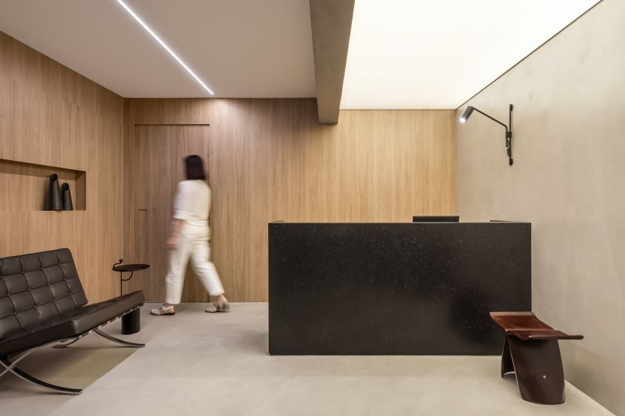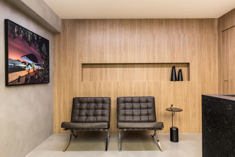 Na recepção, a imponente bancada em granito preto absoluto escovado divide espaço com peças mais clássicas de design, como as poltronas Barcelona, assinadas por Mies Van der Rohe, o banco Butterfly, de Sori Yanagi, e a fotografia autoral impressa em canva do paranaense Daniel Castellano.