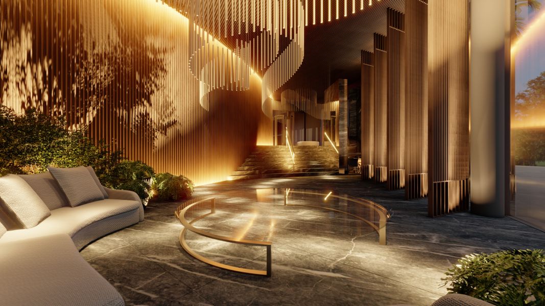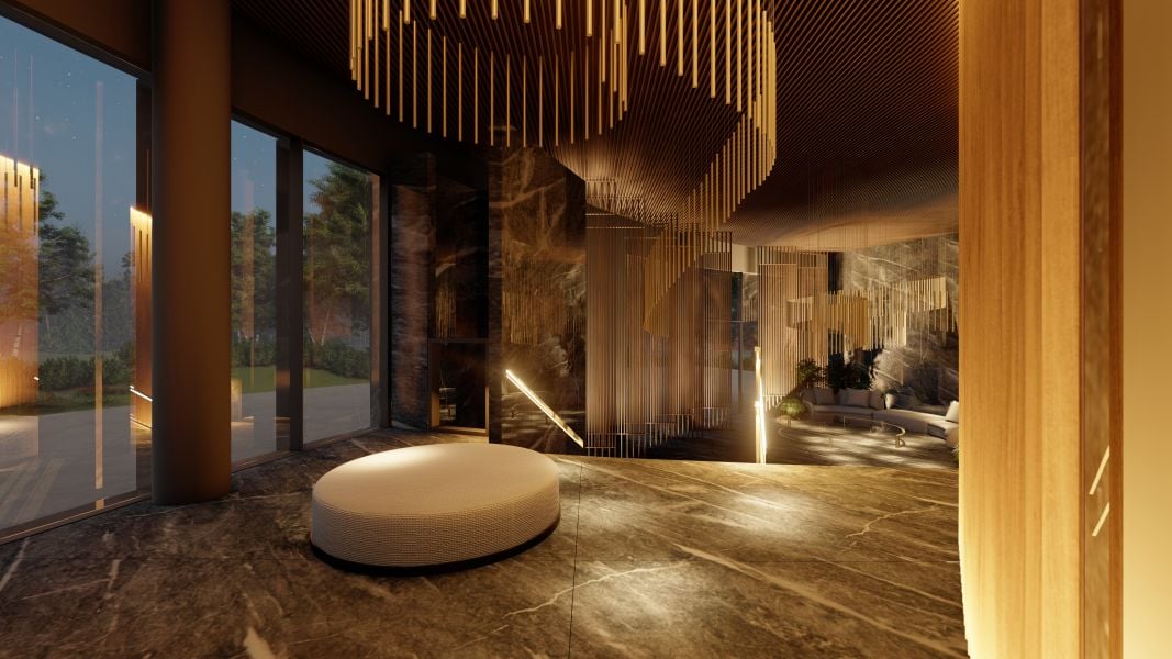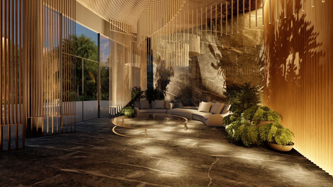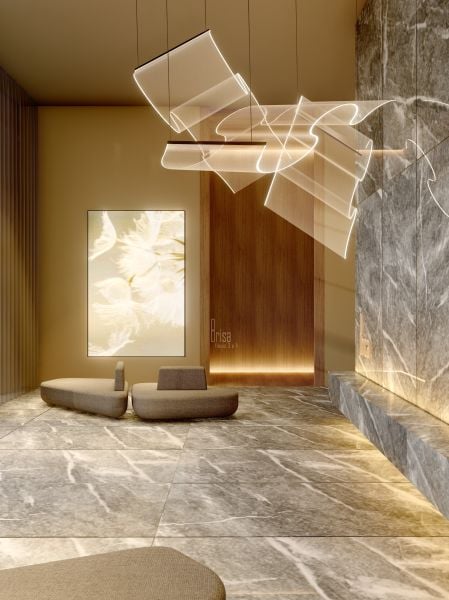No hall central, o uso de pedras naturais tem como objetivo principal transmitir poder, beleza e energia ao ambiente, enquanto a madeira exala aconchego, requinte, personalidade e qualidade sensorial. As imponentes luminárias, desenhadas exclusivamente para o ambiente, lembram o vento e a brisa.