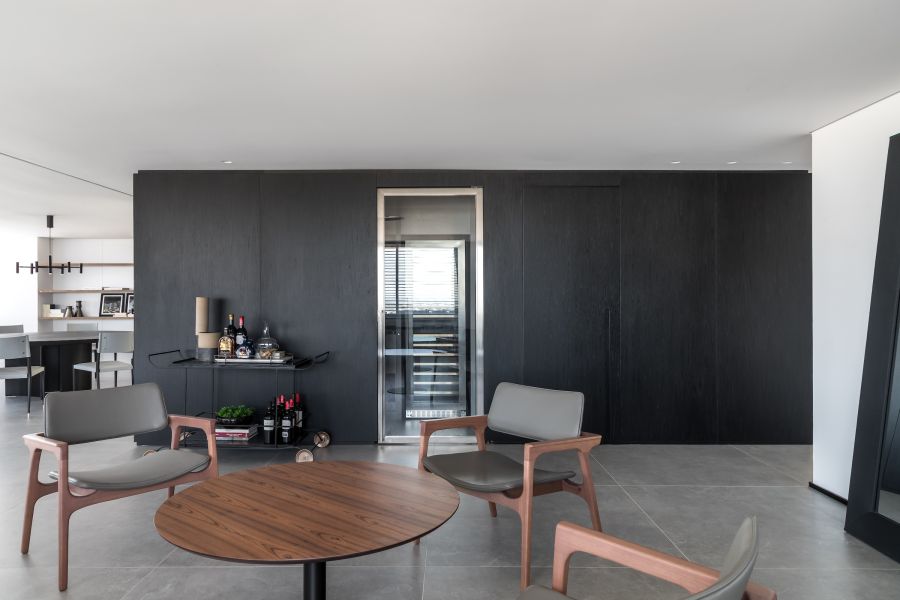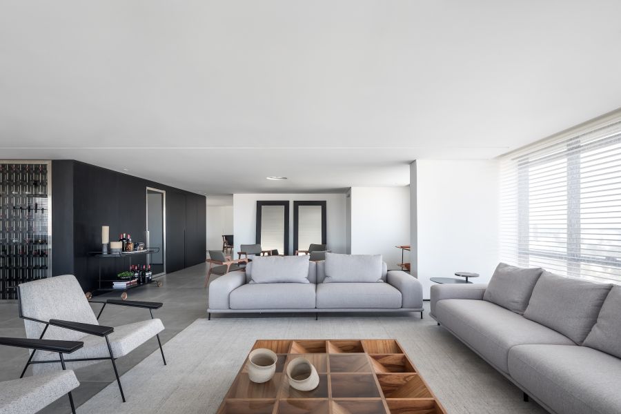 O espaço foi totalmente reformado para se adequar ao uso dos moradores. Dessa forma, a área social se tornou o coração da casa. No centro do living, uma caixa totalmente revestida de lâmina de carvalho ebanizado traz um toque de sofisticação.