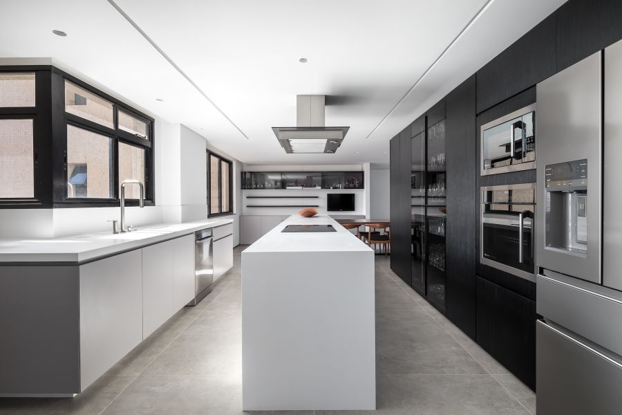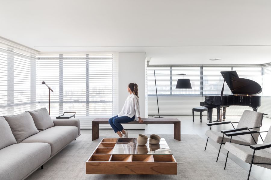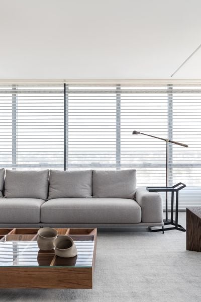 Tons neutros, muito branco e detalhes em cinza completam o décor. A ideia era que a arquitetura não competisse com o skyline, que traz paz e leveza aos ambientes. As grandes janelas também garantem uma boa utilização da luz natural nos espaços, que tem sua entrada suavizada com as persianas da Vertical Persianas.