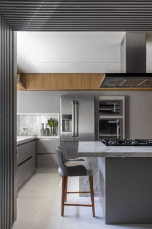 O espaço gourmet se conecta de forma fluida ao terraço por meio de uma porta retrátil, enquanto as amplas portas-janelas garantem a completa integração entre a área externa e o ambiente interno.