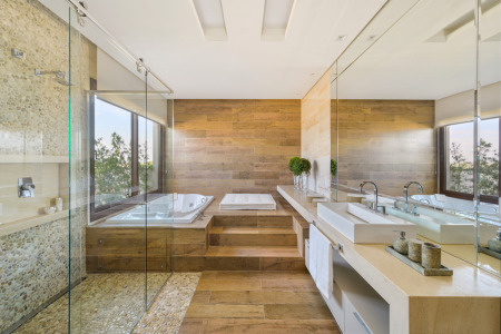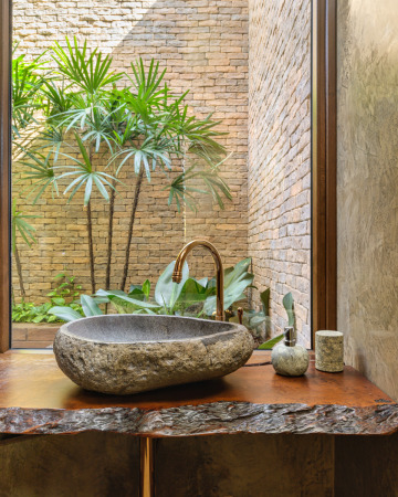 Os seixos e outros detalhes naturais fazem da sala de banho um convite ao relaxamento. (Foto: Renata Salles)