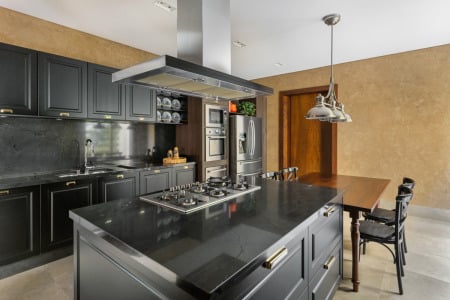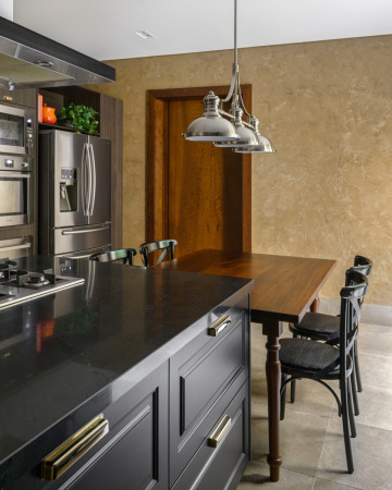 Na cozinha, um granito exótico com acabamento escovado adiciona um toque de luxo à área de preparação de alimentos. (Foto: Renata Salles)