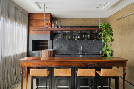 O bar suspenso na bancada gourmet demonstra a atenção aos detalhes e a maestria no uso de materiais naturais. (Foto: Renata Salles)