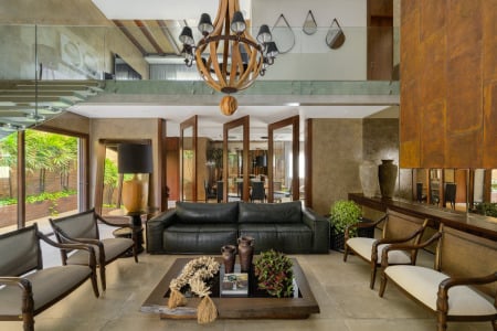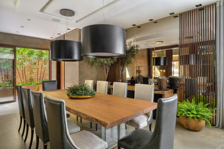 O design interior é marcado por tons neutros, terrosos e pelo uso frequente do preto, que adiciona um toque de elegância ao ambiente. Os espaços são amplos e integrados, inundados de luz natural e conectados com o verde da natureza circundante. Essa composição cria uma atmosfera de conforto e sofisticação que permeia todo o projeto.