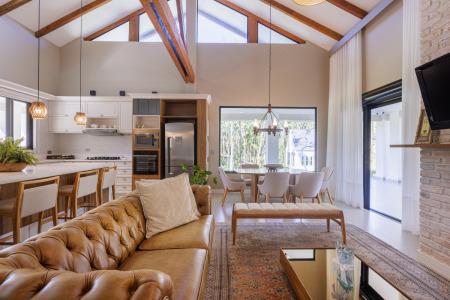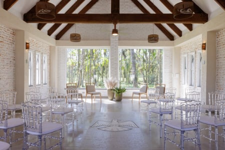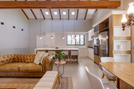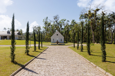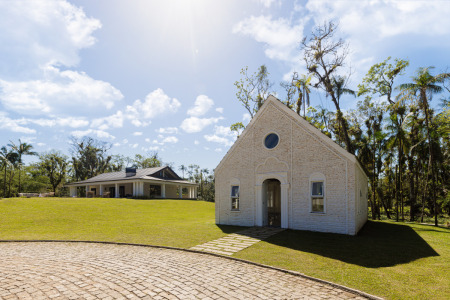 Com 400m² de área construída entre a casa principal e o templo, o conjunto é um refúgio de tranquilidade e um santuário de oração.
