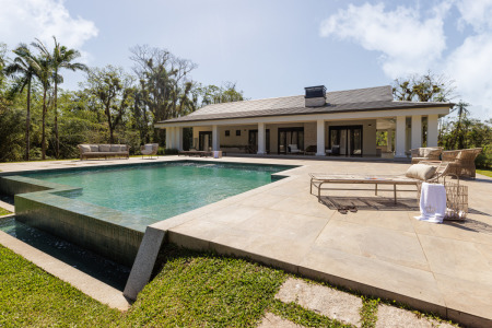 Os tijolinhos de demolição adornam a fachada e as paredes, criando uma atmosfera de calor e aconchego. O revestimento Barlavento Caribbean na piscina confere um toque natural, fazendo parecer um rio sereno em vez de uma piscina convencional.