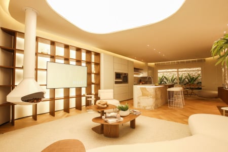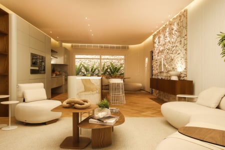 O projeto é eminentemente contemporâneo, integrando espaços com formas curvas que quebram a rigidez, criando um layout orgânico. A paleta de cores suaves e neutras, junto a materiais sofisticados, como o mármore Macchia Oro e Travertino Bruto, cria uma atmosfera leve.