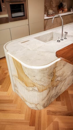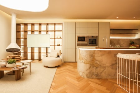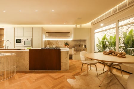 O público-alvo valoriza a estética contemporânea e a integração. Entre os destaques, estão as linhas orgânicas, a ilha de mármore e a vegetação estratégica. O maior desafio dos arquitetos foi manter essa estética rebuscada enquanto garante conforto.