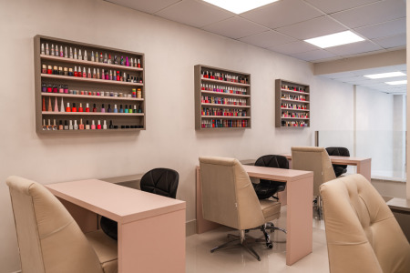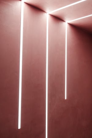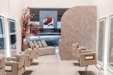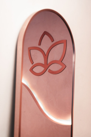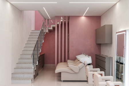 As cores escolhidas, tons de bege e rosa, refletem a identidade visual e o objetivo de criar um espaço feminino e elegante. A iluminação foi cuidadosamente projetada, com curvas na parede de gesso para iluminação indireta, placas de LED no pé-direito duplo e spots direcionáveis. Nos lavatórios, perfis de LED proporcionam um ambiente relaxante durante os tratamentos.