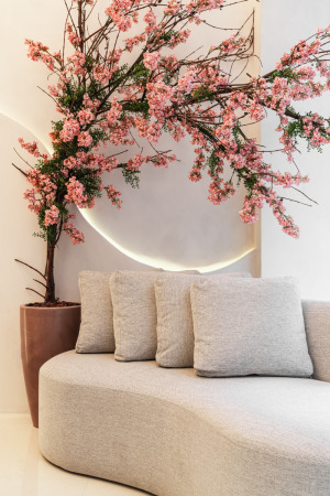 Nathalia Gulgielmin, do Studio Telt, em colaboração com a arquiteta Natasha Chanoski, criaram um espaço comercial de elegância e acolhedor para um público predominantemente feminino de alto padrão. O projeto, em um local de 80m², se destaca pela iluminação confortável, curvas e uma árvore de cerejeira que é, literalmente, a cereja do bolo.