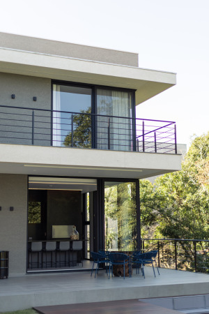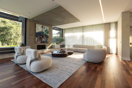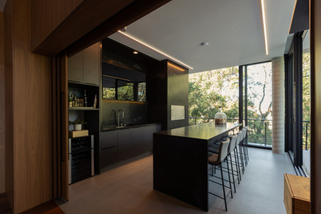 Uma das características mais notáveis dessa criação é a piscina, habilmente suspensa sobre o bosque adjacente, oferecendo uma experiência única e imersiva. A integração dos ambientes internos com a natureza envolvente é uma marca registrada do escritório, e aqui não é diferente. A posição estratégica da casa no terreno e a arquitetura cuidadosamente projetada proporcionam uma conexão perfeita com o ambiente natural, ampliando a sensação de espaço e tranquilidade.