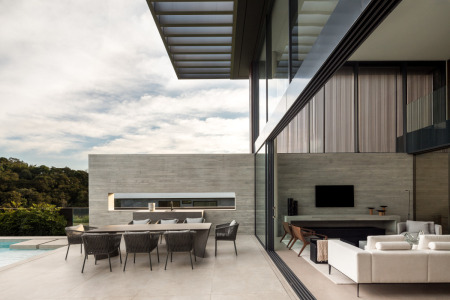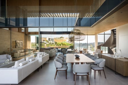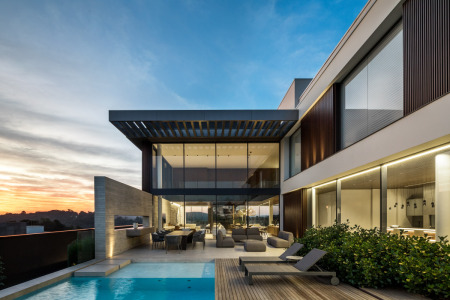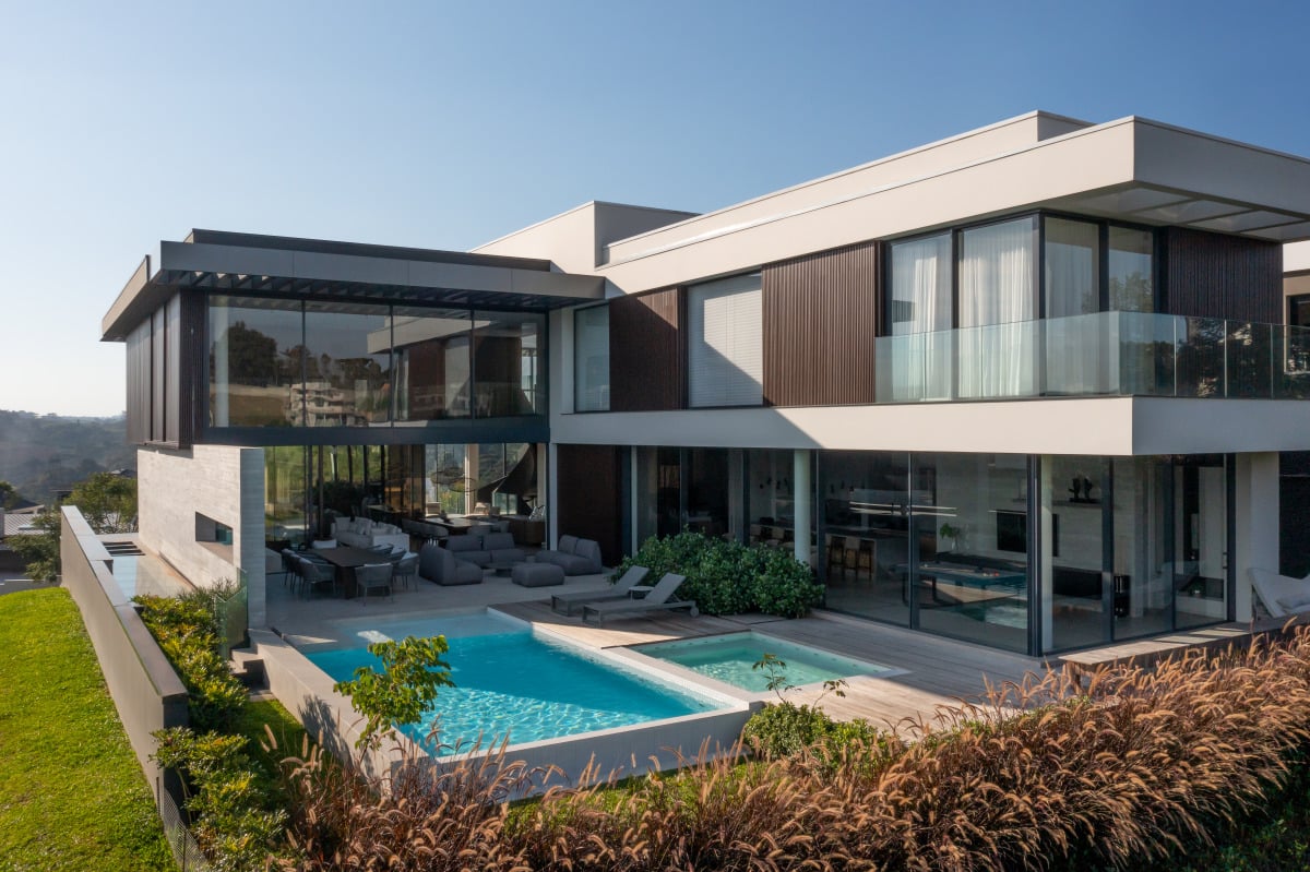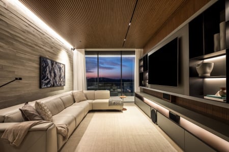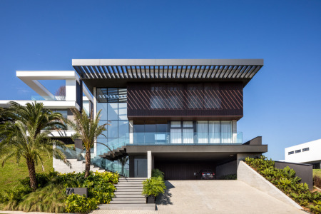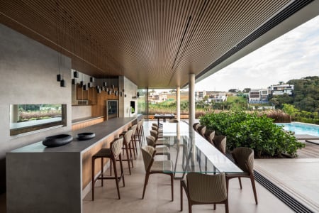 O grande desafio do projeto de 870 m² foi a análise detalhada da topografia e das características da região. A escolha de materiais nobres e naturais foi dos um pontos altos do projeto, resultando em um espaço funcional e luxuoso. Esses materiais são destacados ainda mais na volumetria da fachada e nos brises, que, quando fechados, proporcionam mais privacidade na área íntima.