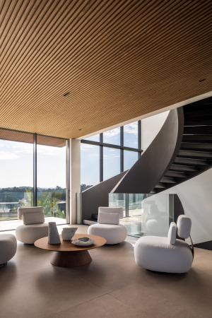 Além do projeto arquitetônico, o escritório também desenvolveu o projeto de interiores da casa. Como no caso do concreto em ripa, que, além de ser o revestimento externo, também adentra os volumes da casa, criando paredes decorativas internas no living, por exemplo. Outro ponto é a escada curva, que traz um aspecto escultural de design entre os pavimentos do projeto.