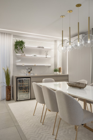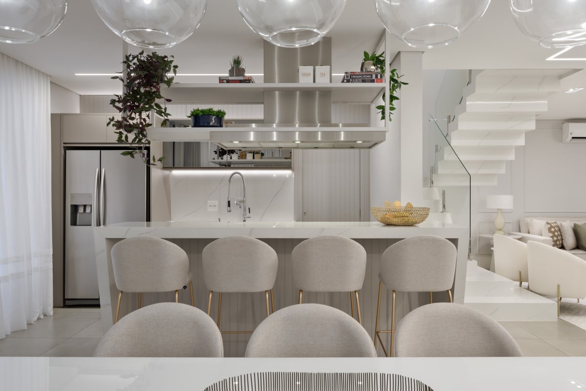 O living e a sala de jantar seguem com o mesmo padrão da assinatura da arquiteta. A lareira da sala e os pontos de dourado no mobiliário solto proporcionam mais aconchego. O aço inox trouxe um toque gourmet à cozinha. A coifa no centro da bancada atende às necessidades da família e ainda entrega uma atmosfera única para os momentos em casa.