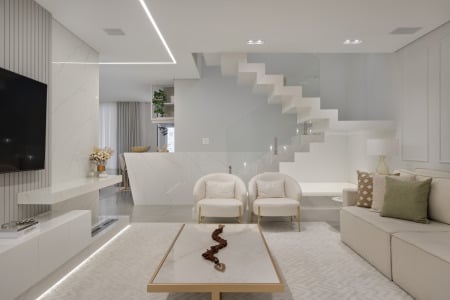 Os tons neutros foram o ponto de partida para trazer o estilo sóbrio e atual para a residência. Dividida em dois pavimentos, a casa conta, no piso térreo, com toda a área social do projeto. A arquiteta valorizou a integração dos ambientes, tendo a escada como polo de setorização dos espaços. Por isso, ela foi revestida de porcelanato esculpido, mesmo material da bancada da cozinha.