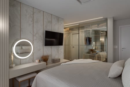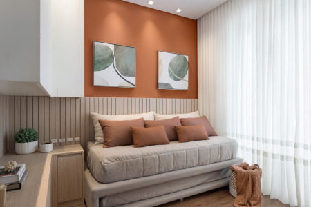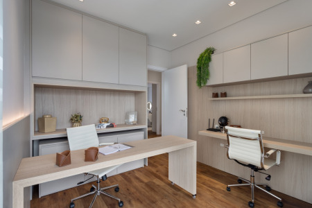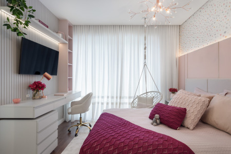 No quarto do casal, o acolhimento foi predominante na concepção da decoração e os elementos e materiais foram pensados no conforto e no bem-estar dos clientes. No quarto da filha, a feminilidade é o conceito principal do espaço – o balanço ainda entrega um estilo romântico e lúdico. No home office, a bancada central possui rodas para que ela se integre ao outro móvel e, assim, libere espaço para a prática de yoga da cliente. Funcionalidade e estética juntas para entregar a melhor rotina de trabalho no cômodo.