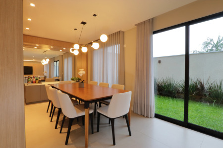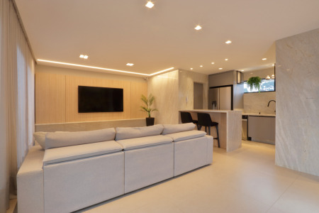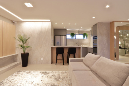 O mármore que reveste a ilha da cozinha cria, também, um grande painel em pedra natural, abraçando o living da residência. Essa sofisticação se mantém na escolha das cores, que valorizam os tons neutros em toda a área social da casa.