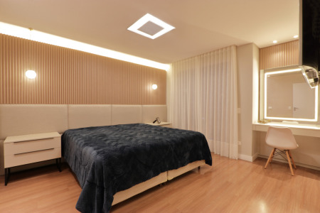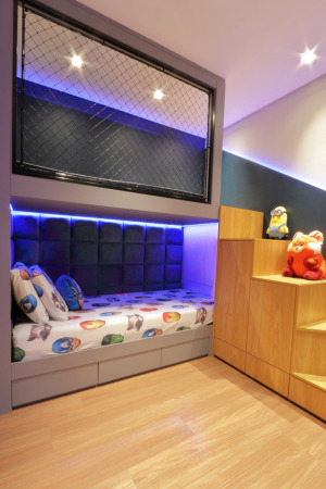 O painel ripado e o espelho criam uma atmosfera tranquila e acolhedora na suíte master do casal. Já no quarto do filho, os super-heróis e a atmosfera lúdica dominam o ambiente. A arquiteta também criou um mezanino em marcenaria para explorar ao máximo os momentos de brincadeira e lazer dos pequenos.