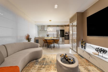 As formas orgânicas marcam presença na área social com o sofá curvo do living. Os tons neutros permitiram que a designer ousasse nas texturas, acabamentos e objetos de decoração. Graças à marcenaria personalizada, o escritório conseguiu atender a demandas bem específicas, como ocultar o ar-condicionado com o basculante ripado ventilado em cima da cristaleira.