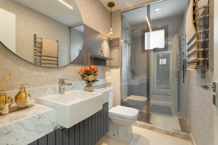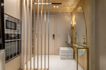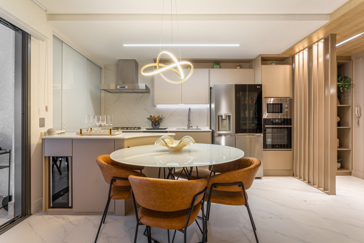 Ao entrar no imóvel, a designer projetou um hall de entrada com marcenaria feita sob medida para o espaço. A divisória vazada esconde a cozinha de forma discreta e sofisticada – o espelho de forma orgânica entrega um charme a mais. Otimizando a circulação integrada do projeto, Giselle optou por uma mesa redonda abraçada pela bancada da cozinha – formando uma grande ilha funcional.