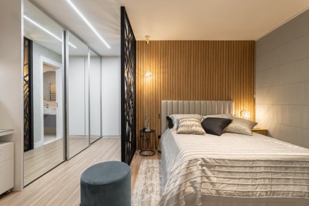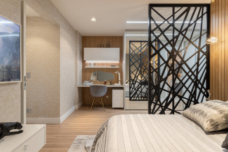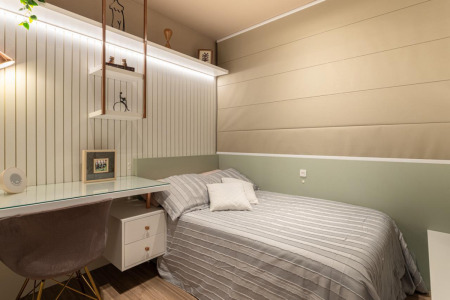 Na área íntima, conforto e bem-estar foram prioridade na assinatura da designer. Na suíte da mãe, o elemento vazado preto setoriza o ambiente, funcionando como divisória entre quarto e closet. A penteadeira serve como um espaço de apoio no closet. Para a filha, os tons naturais do verde deixaram o quarto ainda mais aconchegante. Uma bancada de home office foi criada para atender à rotina da jovem. O projeto luminotécnico do apartamento conta com uma iluminação que atende à finalidade de cada ambiente, intimista nos quartos e direcionada na área social.
