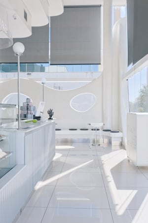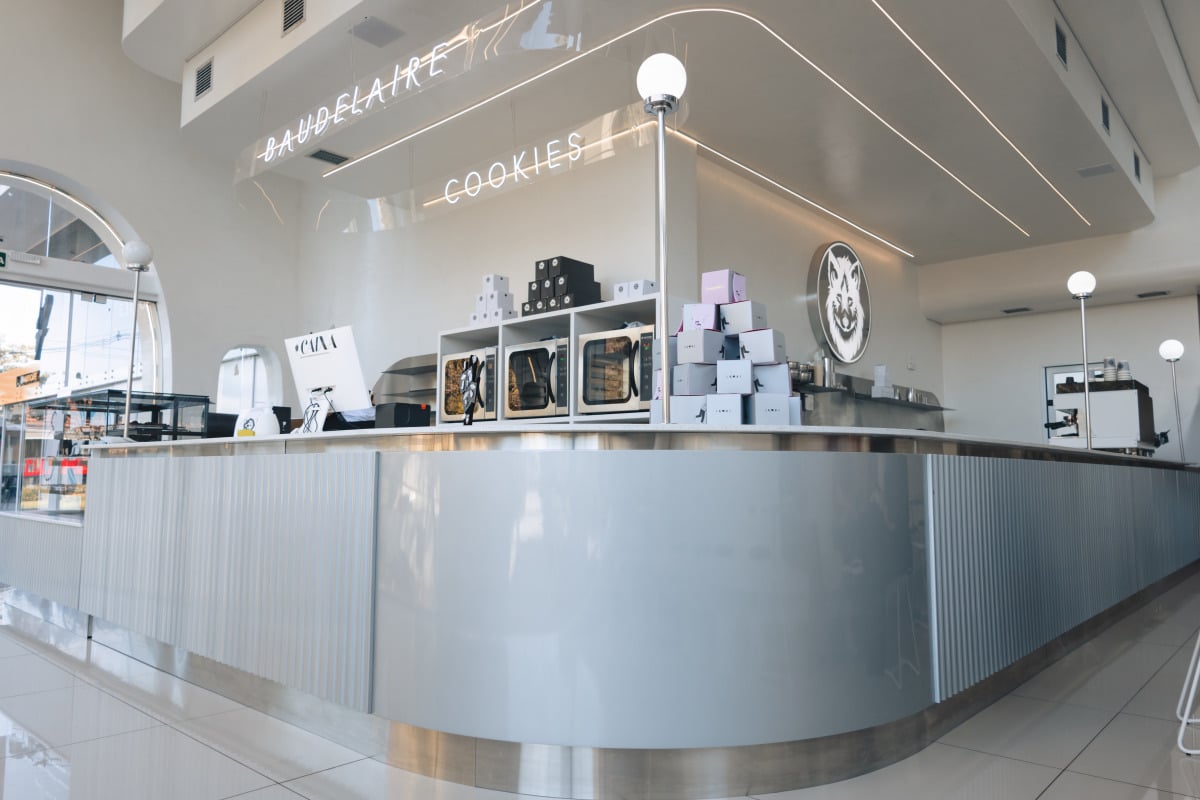 Os 107 m² da loja foram desenvolvidos também para proporcionar uma logística mais funcional a toda a equipe de produção e atendimento ao público. O grande balcão é o destaque do espaço, sendo a moldura de todo o layout desenvolvido. O banco em formato orgânico cria também um contraste com a linearidade da arquitetura. Um projeto que une experiência gastronômica e design.