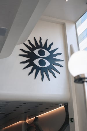 A fachada foi pensada para ser uma entrada de uma caverna, com formas orgânicas, passando a atmosfera de um portal. A logo, em inox, na própria entrada do estabelecimento, contrasta com a parte interna do café.