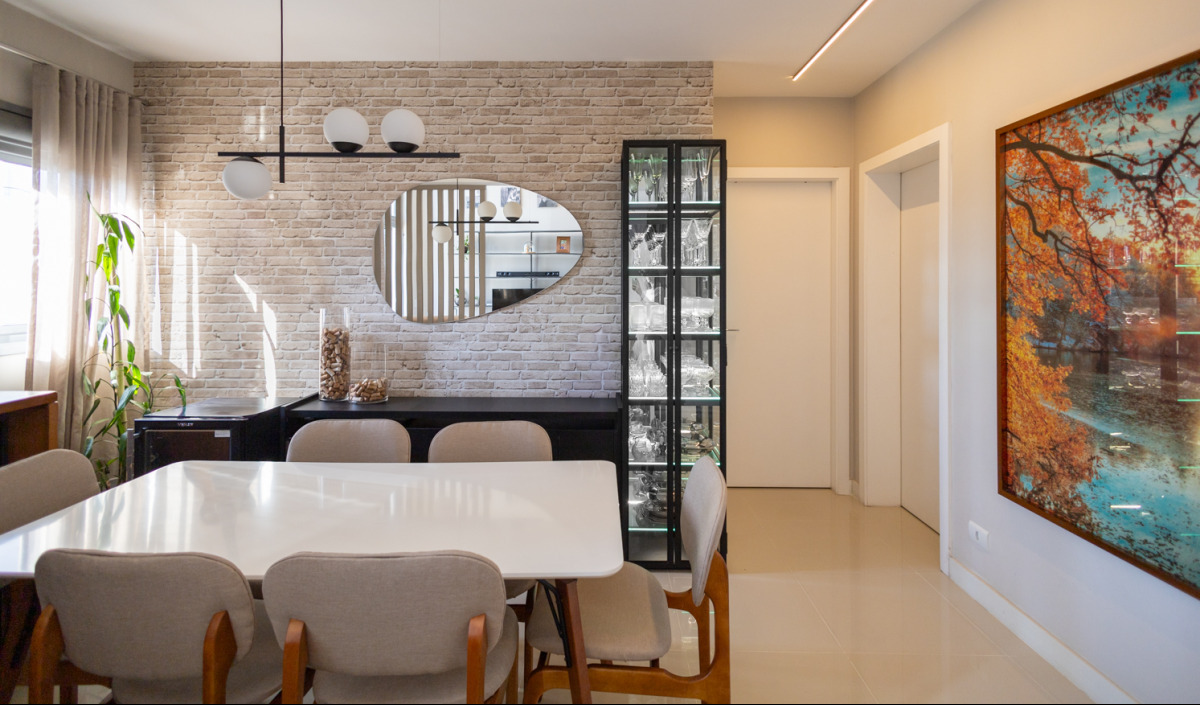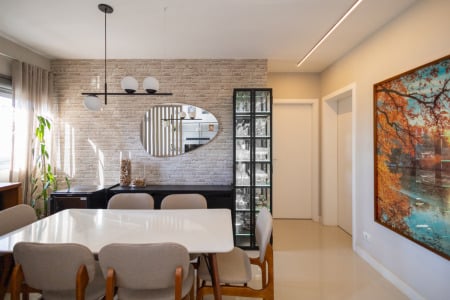Na sala de jantar, a experiência gastronômica e o bem-receber foram conceitos explorados ao máximo no projeto de interiores. O ambiente dispõe de uma adega para os amantes de vinho, um bar estilizado que evoca memórias afetivas do casal, e uma cristaleira que cria diferentes volumes no espaço, expondo as peças de vidro e cristal dos moradores.