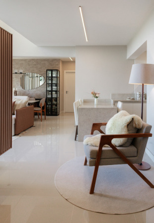 A paleta cromática neutra com toques de tons quentes, junto das texturas cuidadosamente selecionadas pela arquiteta, transformaram este apartamento em um refúgio afetivo para os moradores.