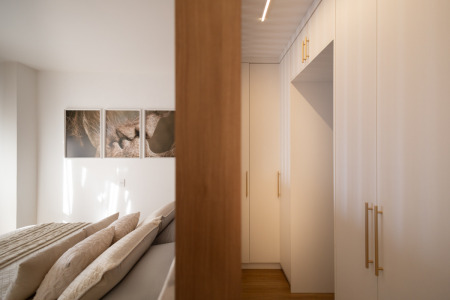 Respeitando e valorizando as peças de memória afetiva dos clientes, um hall de entrada integrado a uma pequena sala de estar oferece toda a estrutura necessária para a rotina da família. A sala de jantar/ tv conta com uma estante multifuncional, que atende ao home theater, espaço de armazenamento e decoração afetiva.