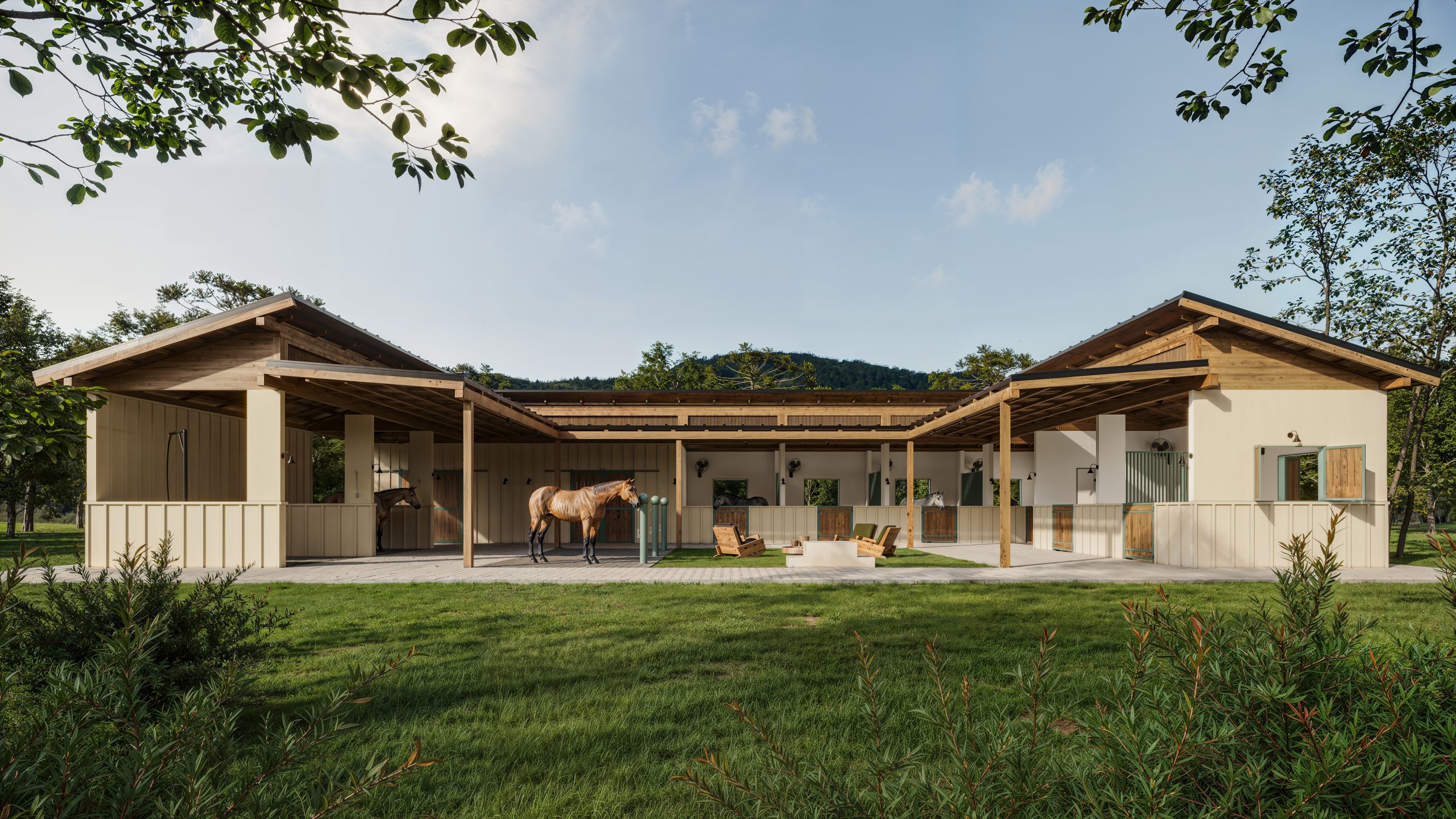 A volumetria equilibrada da construção traz telhados amplos, com ripados em madeira aparente que garantem sombra e ventilação cruzada, elementos indispensáveis para o bem-estar dos animais. A paleta de cores é suave, com tons terrosos e verdes que dialogam com a vegetação nativa, enquanto os painéis de madeira conferem calor e sofisticação.