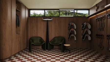 O projeto também contempla um quarto de sela impecável, com acabamento em madeira natural, iluminação embutida e uma marcenaria sob medida que organiza arreios, capacetes, botas e uniformes. Um ambiente que revela o cuidado com o cavalo e com o cavaleiro — e que traduz o estilo de vida elegante de quem vive o campo com paixão e propósito.