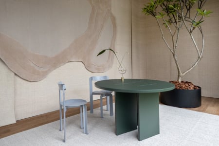 A seleção abrange as coleções Goa e Mahara, feitas à mão na Índia e produzidas em lã e algodão. O arquiteto explica que essa abordagem contemporânea da Botteh dialoga perfeitamente com o trabalho desenvolvido pelo escritório, bem como com toda a curadoria de mobiliário autoral.