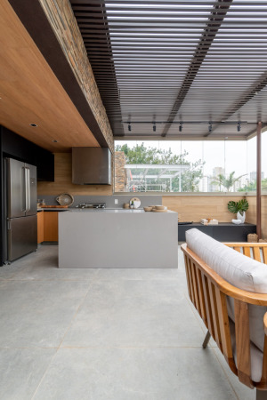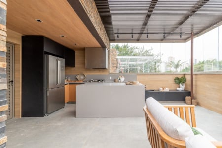 Na área externa, com uma paleta que mescla nuances de cinza a elementos naturais, a varanda é envolvida por tons de madeira em mobiliário, na parede e no teto, seguindo a mesma solução da cozinha. A residência integra o Casa Jardim Experiência, um empreendimento da Seed Incorp.