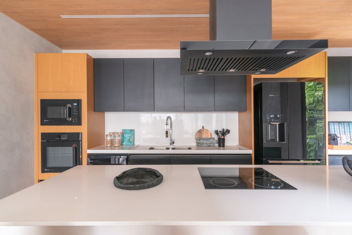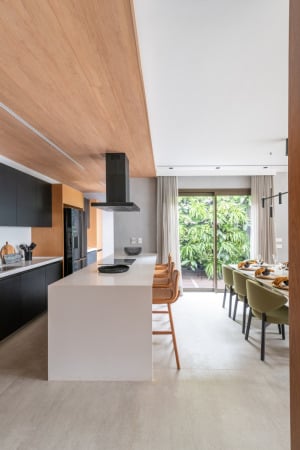 O gourmet traz uma ampla bancada em ilha para preparo de alimentos, que concentra também espaço para refeições rápidas. Nele, Teto Vinílico Origens Carvalho se destaca como uma solução estética e funcional que setoriza o ambiente, delimitando cozinha e sala de jantar. O teto branco ganha o revestimento, com leve rebaixamento, que dá versatilidade ao projeto luminotécnico, assim como simplifica a instalação de equipamentos como coifas, ampliando as possibilidades de configurações dos espaços.