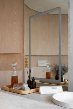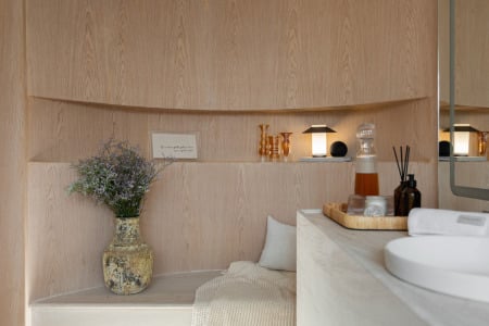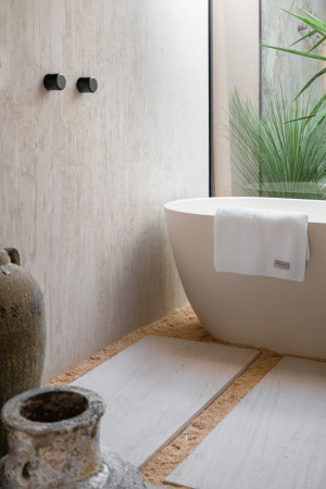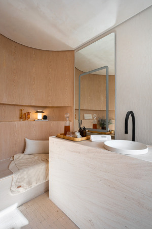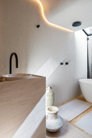 O ambiente apresenta duas grandes tendências de interiores. A cor “greige”, uma mistura de cinza e bege, confere elegância e serve como base para a composição autêntica; já a pintura do forro simula o limewash, uma técnica milenar que voltou a ganhar destaque recentemente pelo seu efeito e beleza. O design do Banheiro Regato prioriza elementos orgânicos que conduzem o olhar do visitante no espaço.